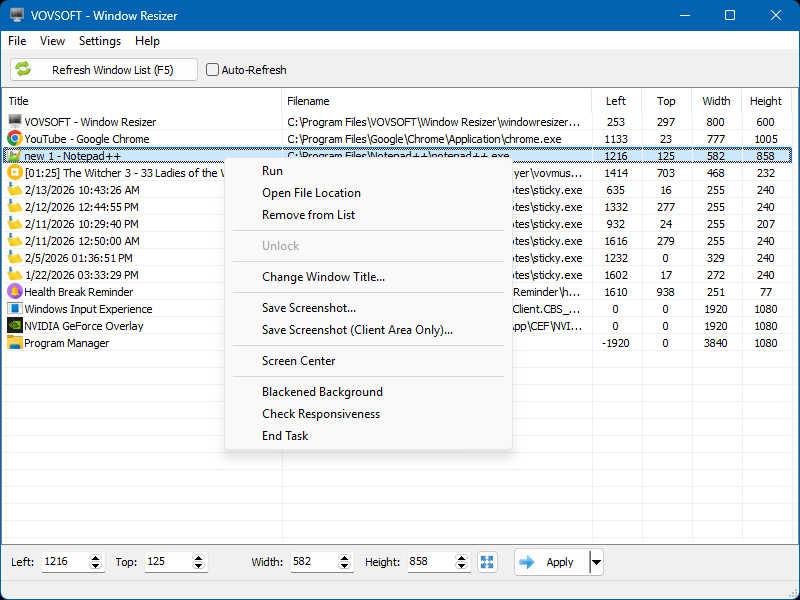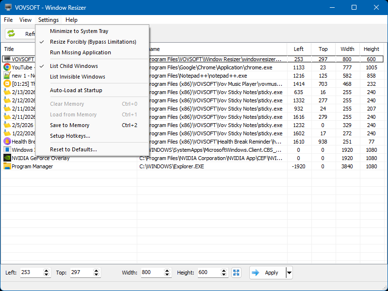 Some applications are resistant to resizing, either because they use fixed dimensions or restrict resizing to certain ranges. Window Resizer bypasses these limits by modifying window dimensions at the system level. The "Resize Forcibly (Bypass Limitations)" option ensures even stubborn apps can be resized to your exact values.