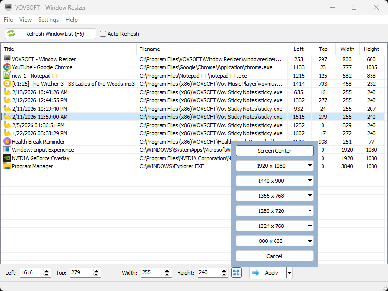 When you open the program, it shows the list of all apps running on your Windows PC. You can select any app and specify the size at the bottom section and click on the "Apply" button.
